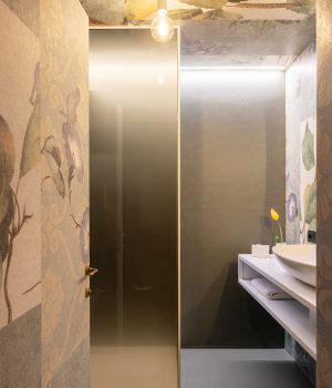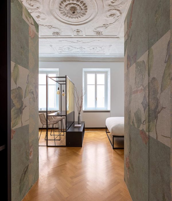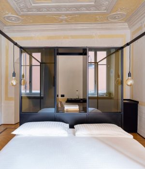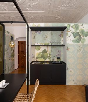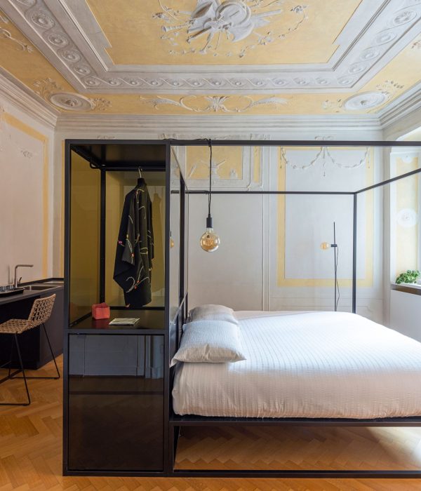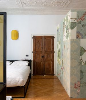 Il progetto di interior è a firma di Fabio Pasini dello studio di architettura Krej che ha sviluppato una soluzione abitativa inedita, un’alternativa al concetto classico di arredo: al centro di ogni stanza trovano sede delle installazioni di ferro e vetro stratificato che diventano di volta in volta elementi dell’abitare. Ogni dettaglio è stato disegnato e realizzato su misura da maestranze locali. L’arredo neutro definisce lo spazio lasciando libere le pareti allo dispiegarsi delle wallpaper offrendo un’esperienza artistico-architettonica unica.
