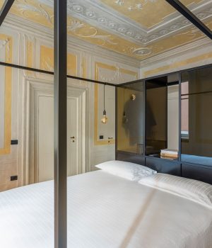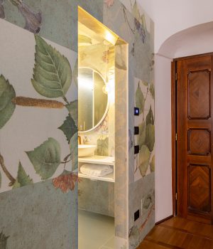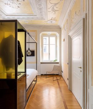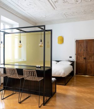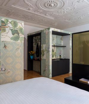 Monolocale Delux è uno studio di 50 mq completamente accessoriato. L’arte contemporanea, proposta dalla carta da parati firmata dall’artista Donatella Spaziani per CARTEdition, insieme al design e all’arredo progettato da Krej Engineering, dialogano con stucchi e decori dell’antico palazzo. Un ambiente accogliente e riservato, perfetto per due persone o per una famiglia.