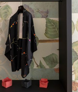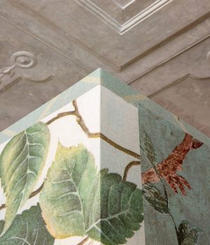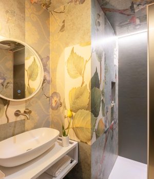 misura da maestranze locali. L’arredo neutro definisce lo spazio lasciando libere le pareti allo dispiegarsi delle wallpaper offrendo un’esperienza artistico-architettonica unica.