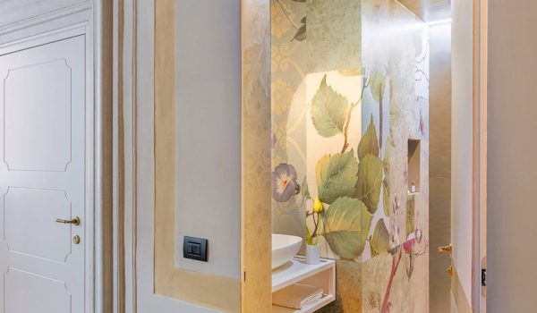 Protagoniste sono le pareti con il progetto d’arte di Donatella Spaziani realizzato su carte da parati da cui prende il titolo l’appartamento.