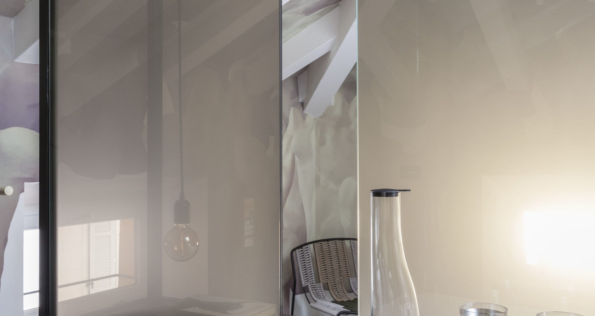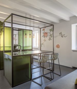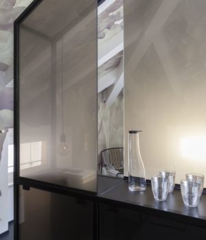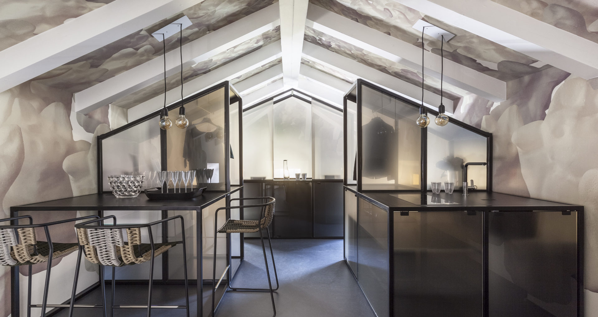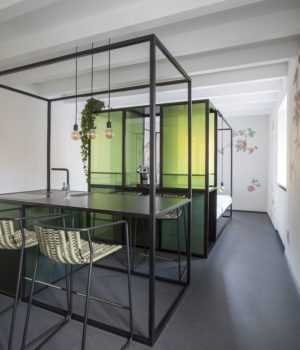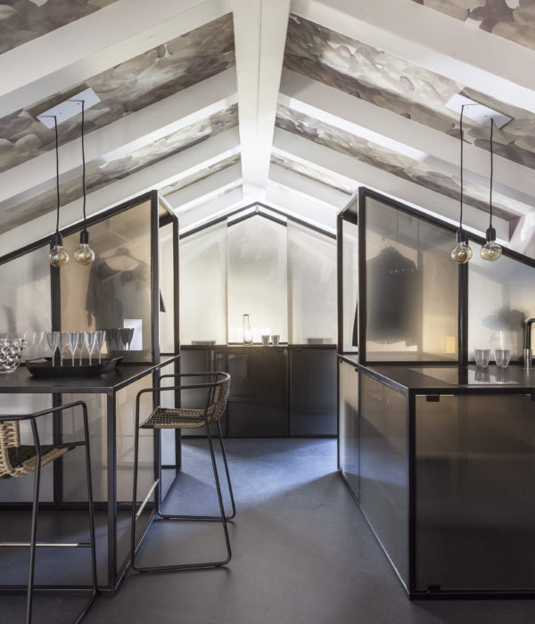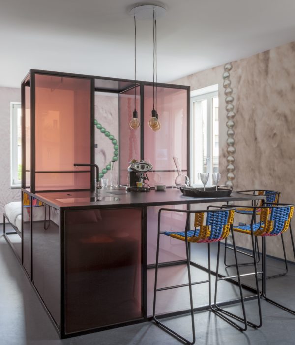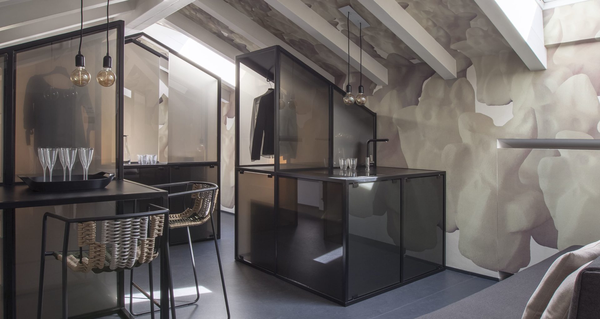 Il progetto di interior è a firma di Fabio Pasini dello studio di architettura Krej che ha sviluppato una soluzione abitativa inedita, un’alternativa al concetto classico di arredo: al centro di ogni stanza trovano sede delle installazioni di ferro e vetro stratificato che diventano di volta in volta elementi dell’abitare. Ogni dettaglio è stato disegnato e realizzato su