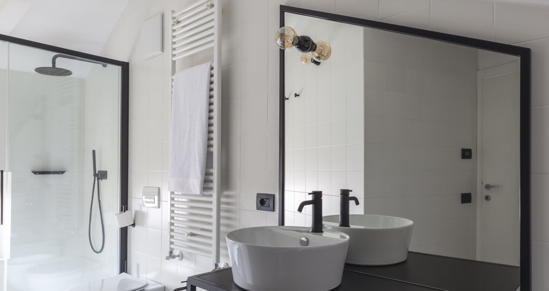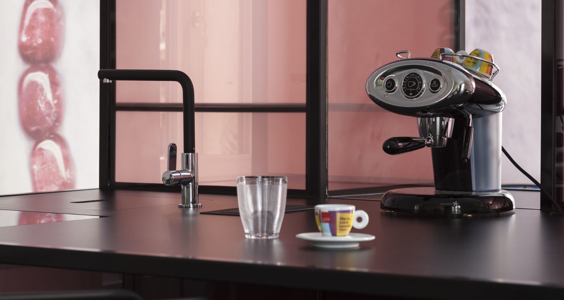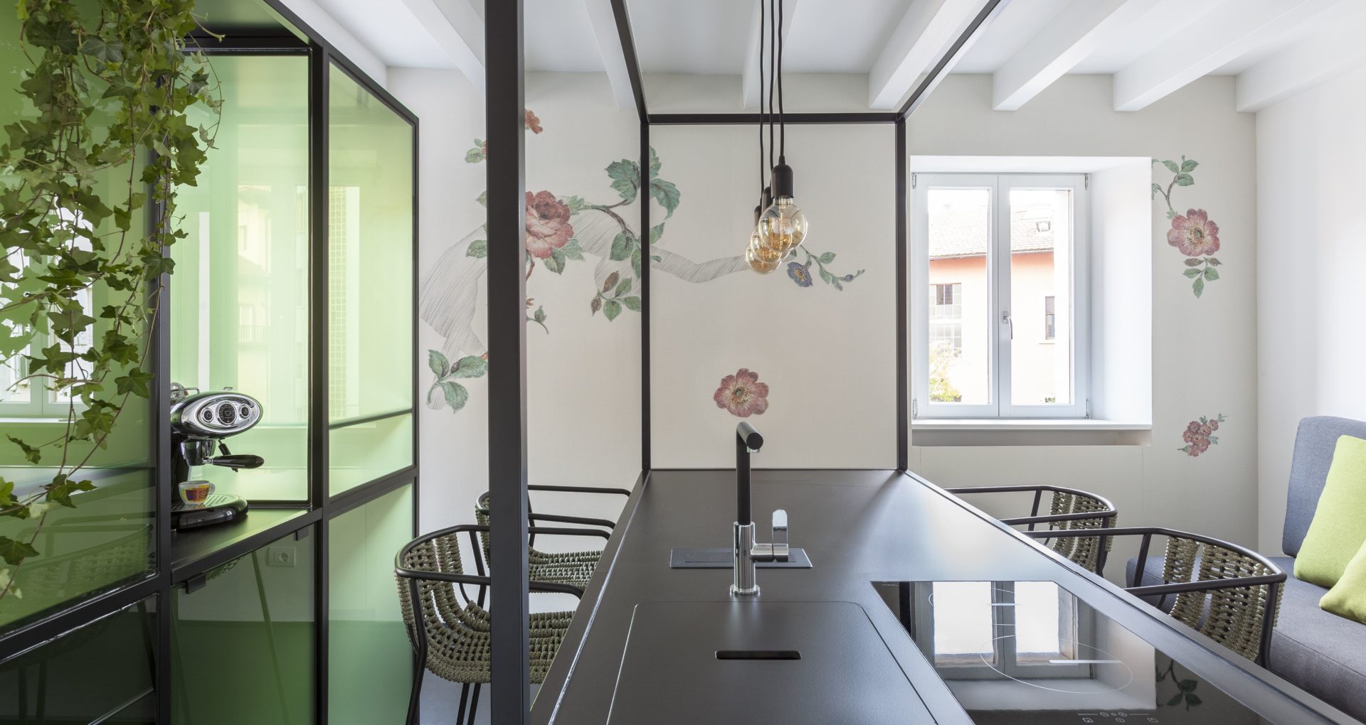 Il progetto di interior è a firma di Fabio Pasini dello studio di architettura Krej che ha sviluppato una soluzione abitativa inedita, un’alternativa al concetto classico di arredo: al centro di ogni stanza trovano sede delle installazioni di ferro e vetro stratificato che diventano di volta in volta elementi dell’abitare. Ogni dettaglio è stato disegnato e realizzato su