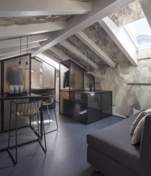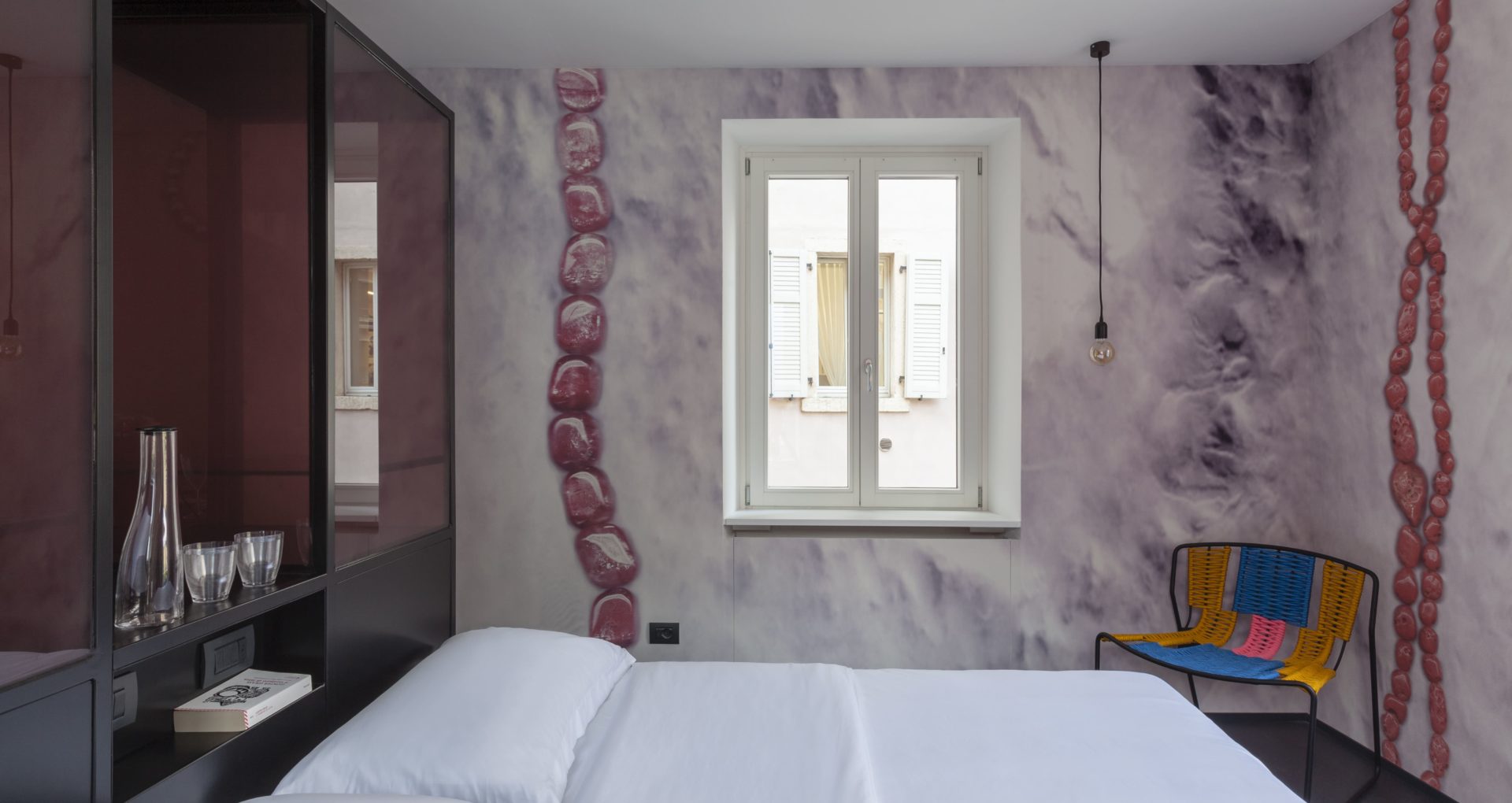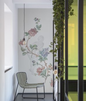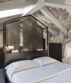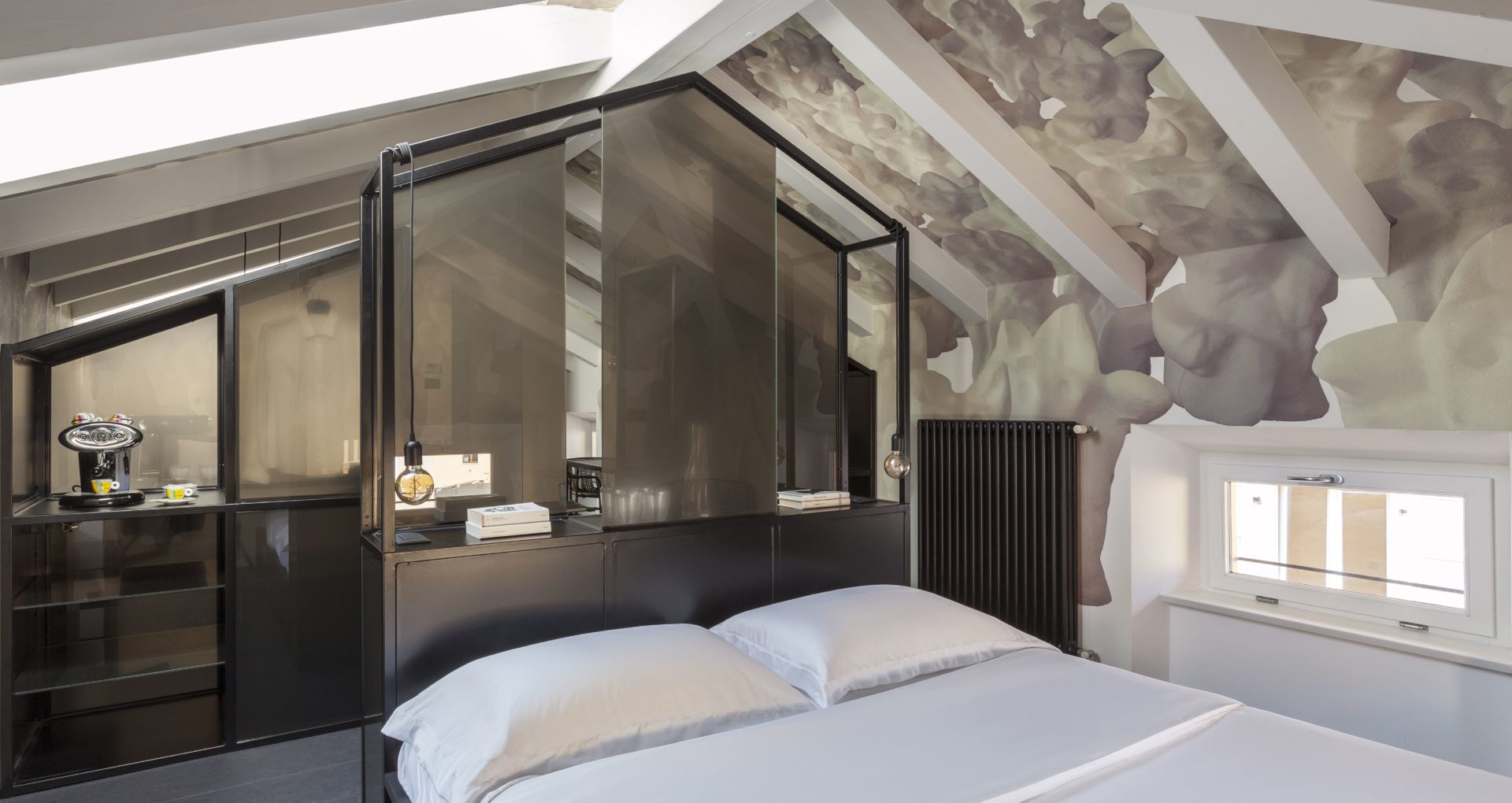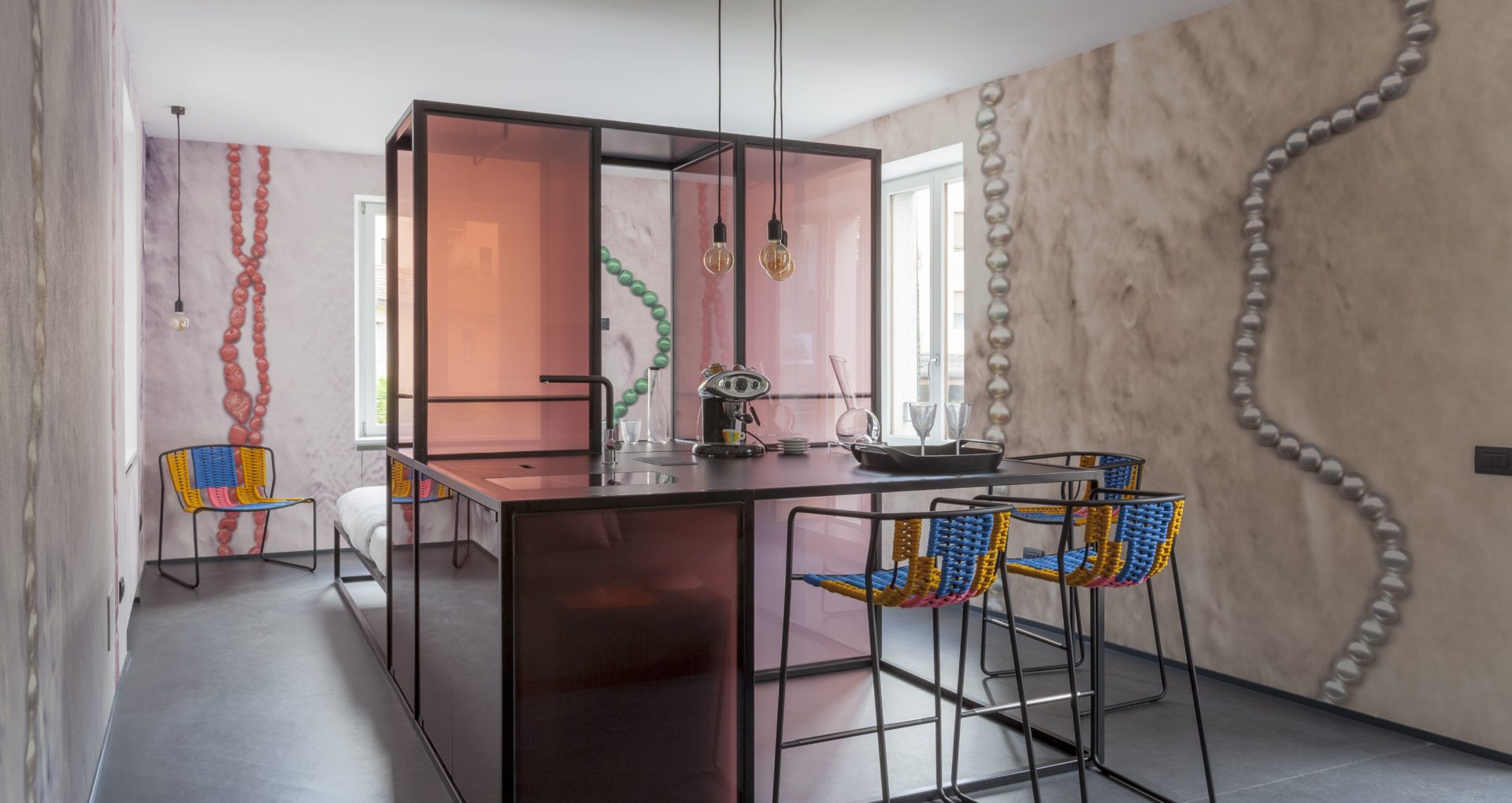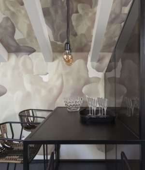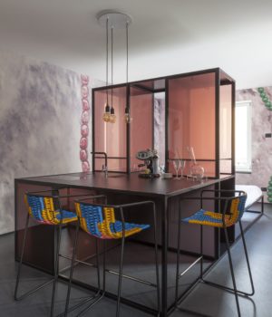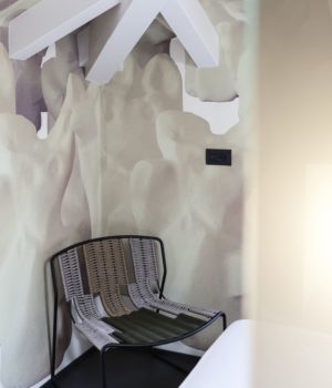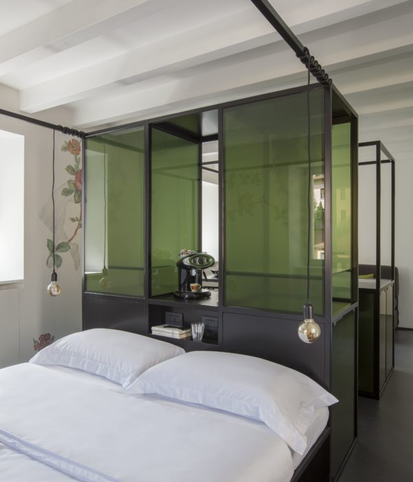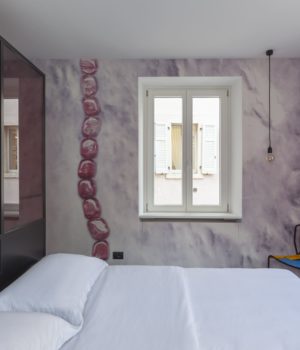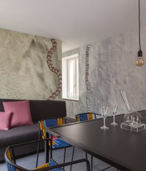 Il progetto di interior è a firma di Fabio Pasini dello studio di architettura Krej che ha sviluppato una soluzione abitativa inedita, un’alternativa al concetto classico di arredo: al centro di ogni stanza trovano sede delle installazioni di ferro e vetro stratificato che diventano di volta in volta elementi dell’abitare. Ogni dettaglio è stato disegnato e realizzato su misura da maestranze locali. L’arredo neutro definisce lo spazio lasciando libere le pareti allo dispiegarsi delle wallpaper offrendo un’esperienza artistico-architettonica unica.