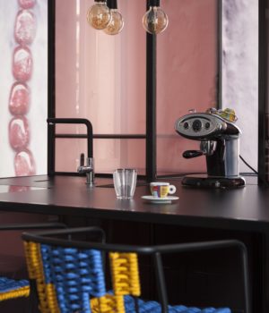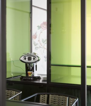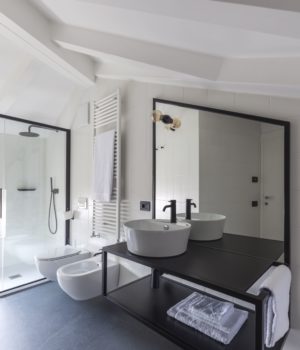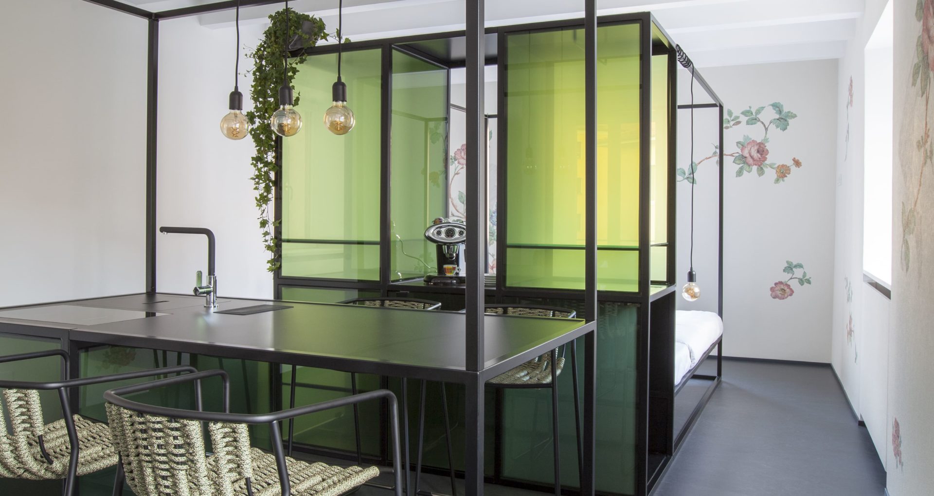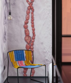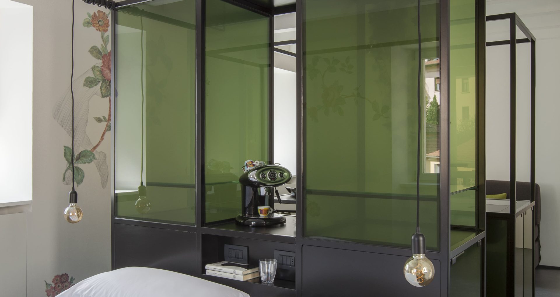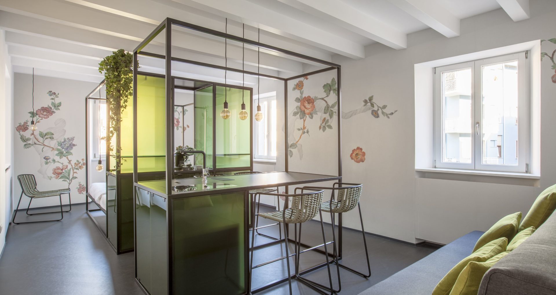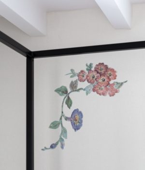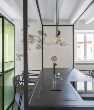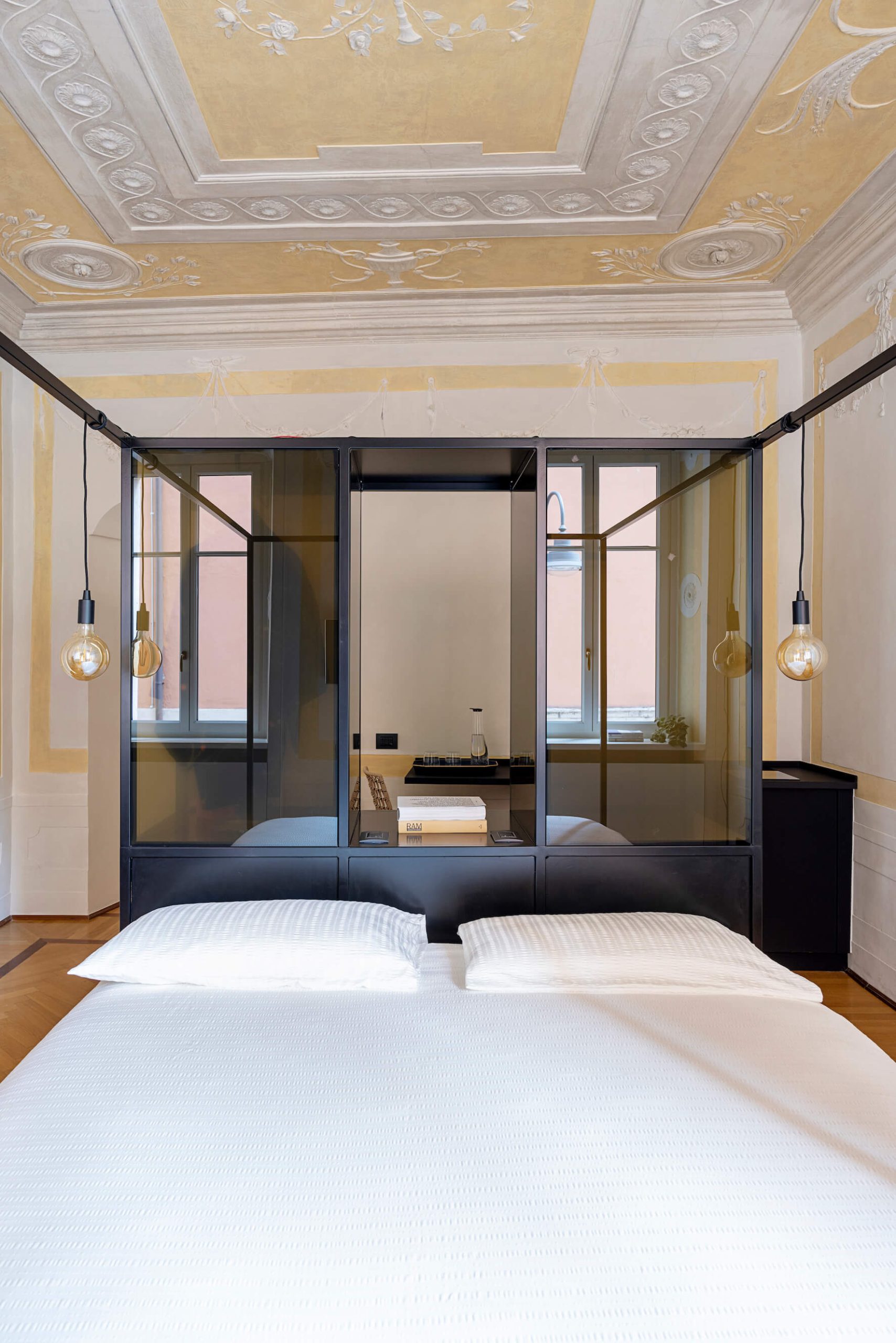 Il progetto di interior è a firma di Fabio Pasini dello studio di architettura Krej che ha sviluppato una soluzione abitativa inedita, un’alternativa al concetto classico di arredo: al centro di ogni stanza trovano sede delle installazioni di ferro e vetro stratificato che diventano di volta in volta elementi dell’abitare. Ogni dettaglio è stato disegnato e realizzato su misura da maestranze locali. L’arredo neutro definisce lo spazio lasciando libere le pareti allo dispiegarsi delle wallpaper offrendo un’esperienza artistico-architettonica unica.