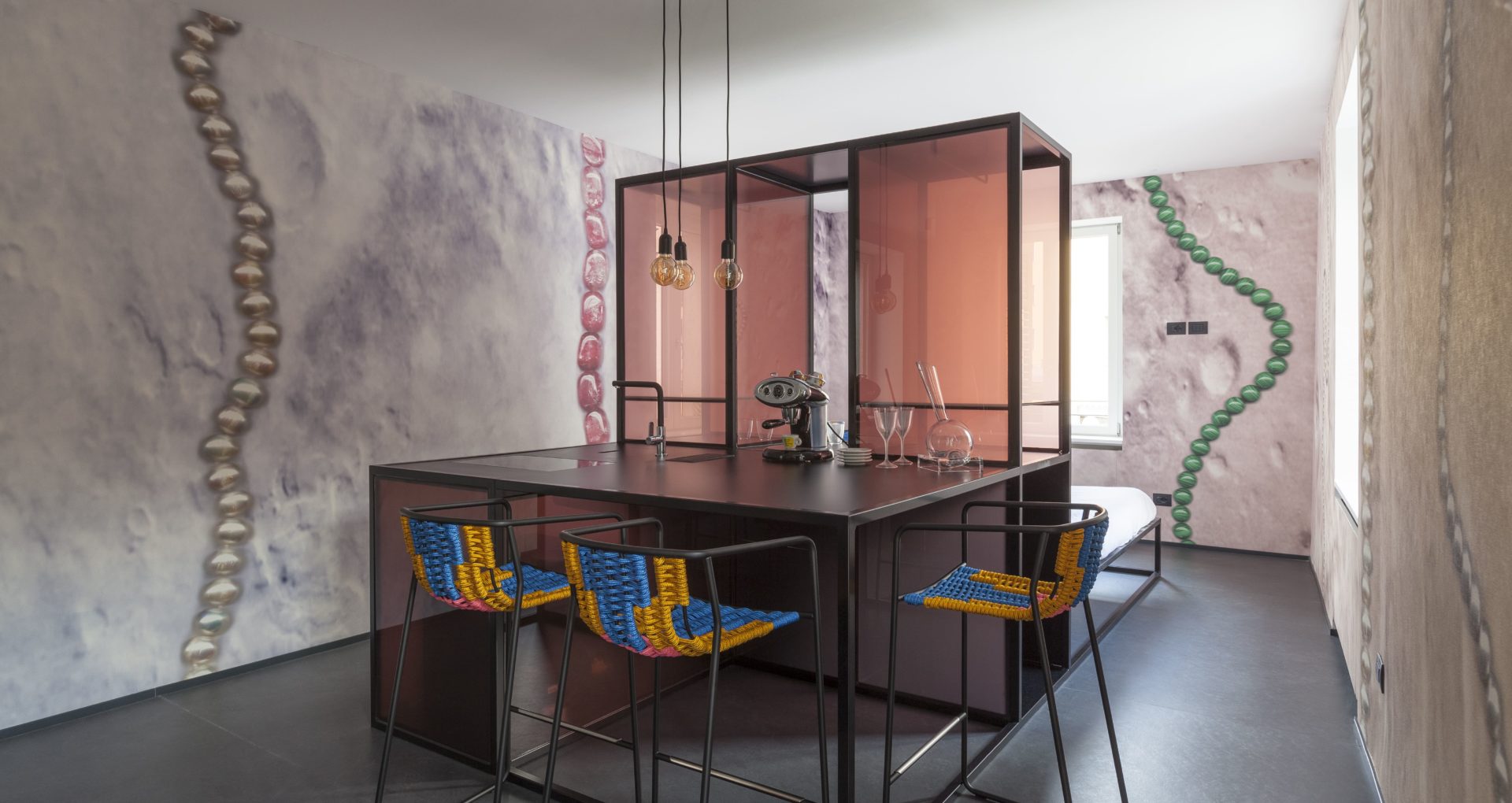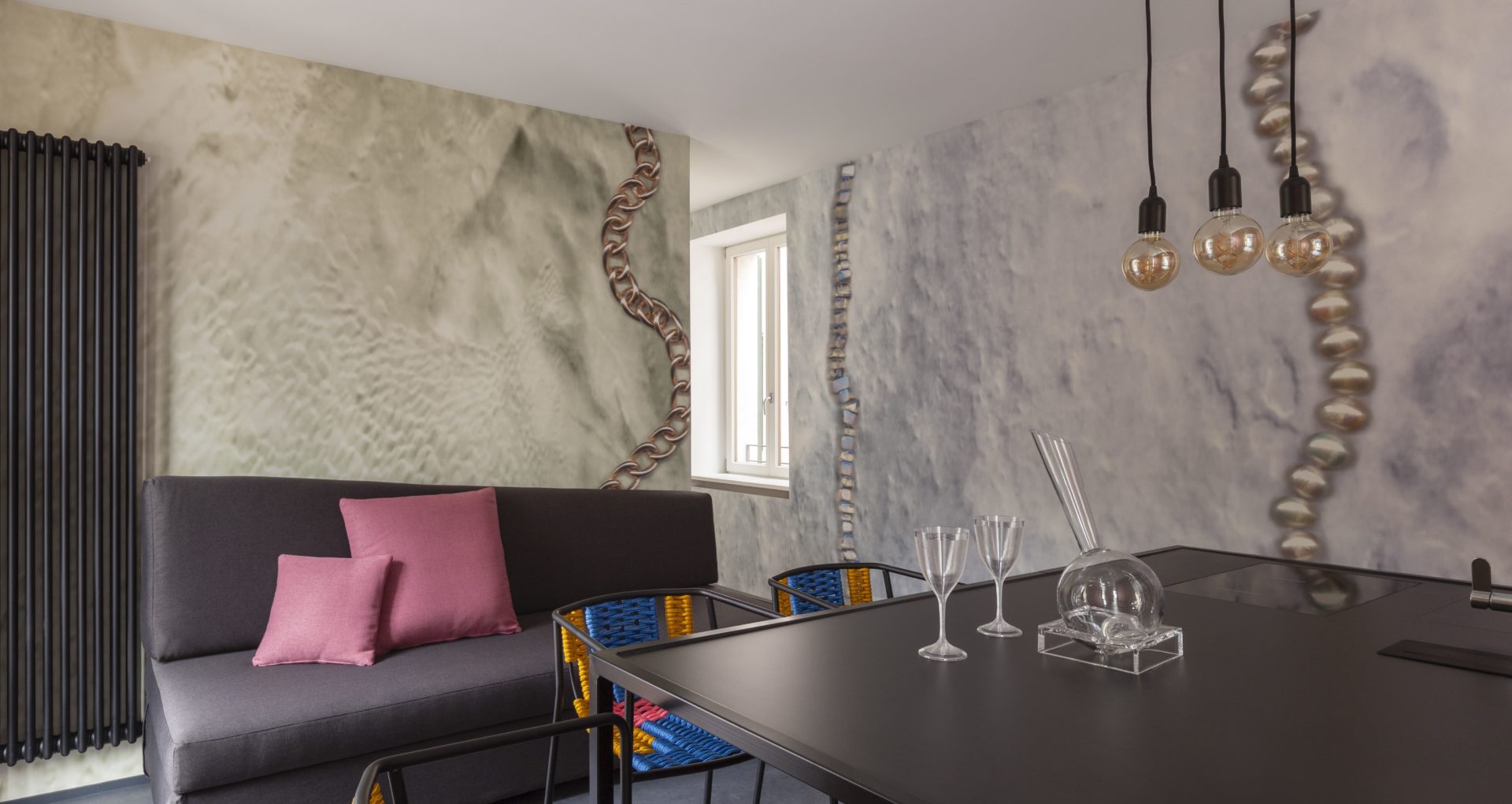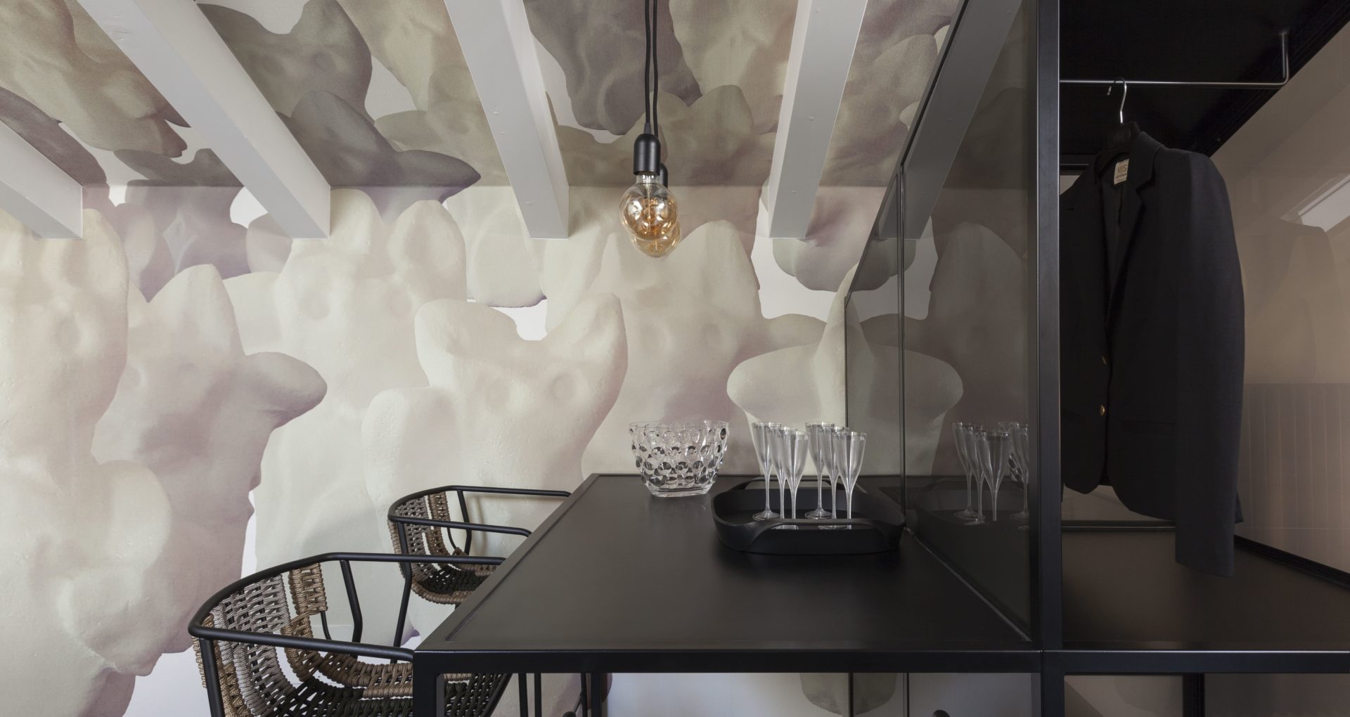 Protagoniste sono le pareti con il progetto d’arte di Riccardo Previdi realizzato su carte da parati da cui prende il titolo l’appartamento.