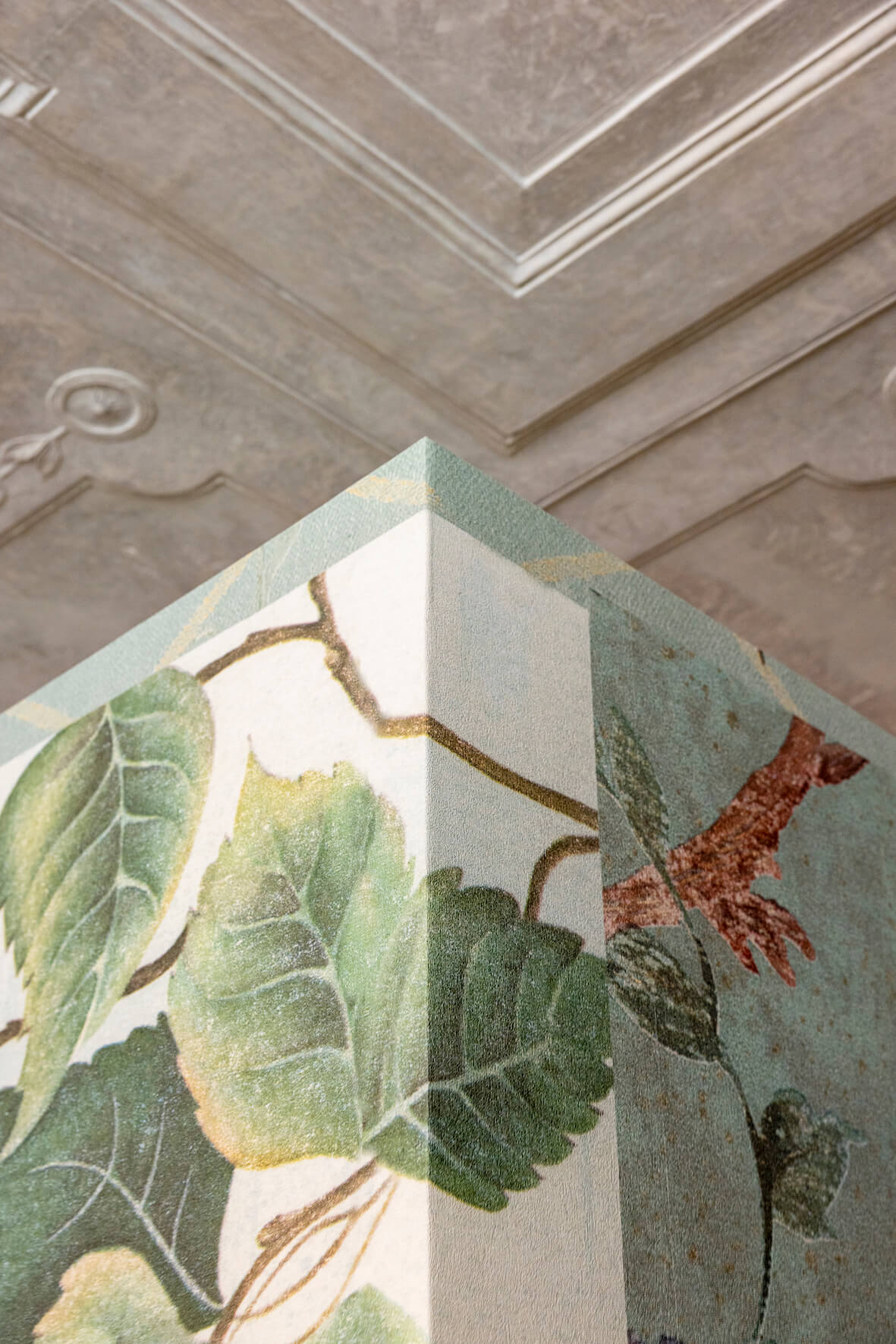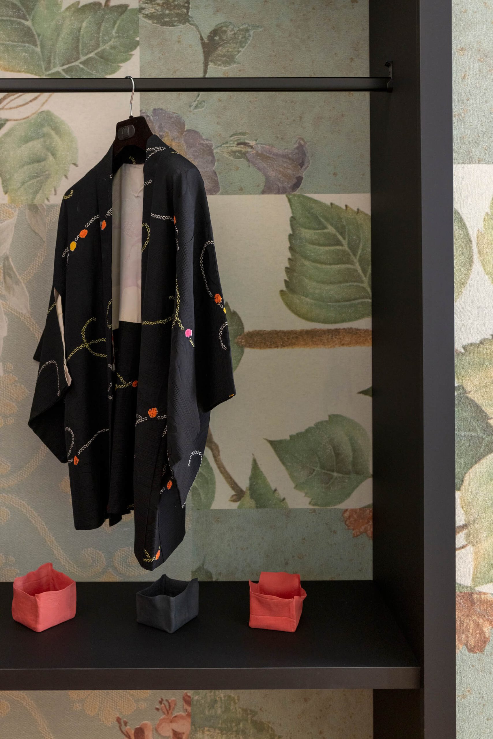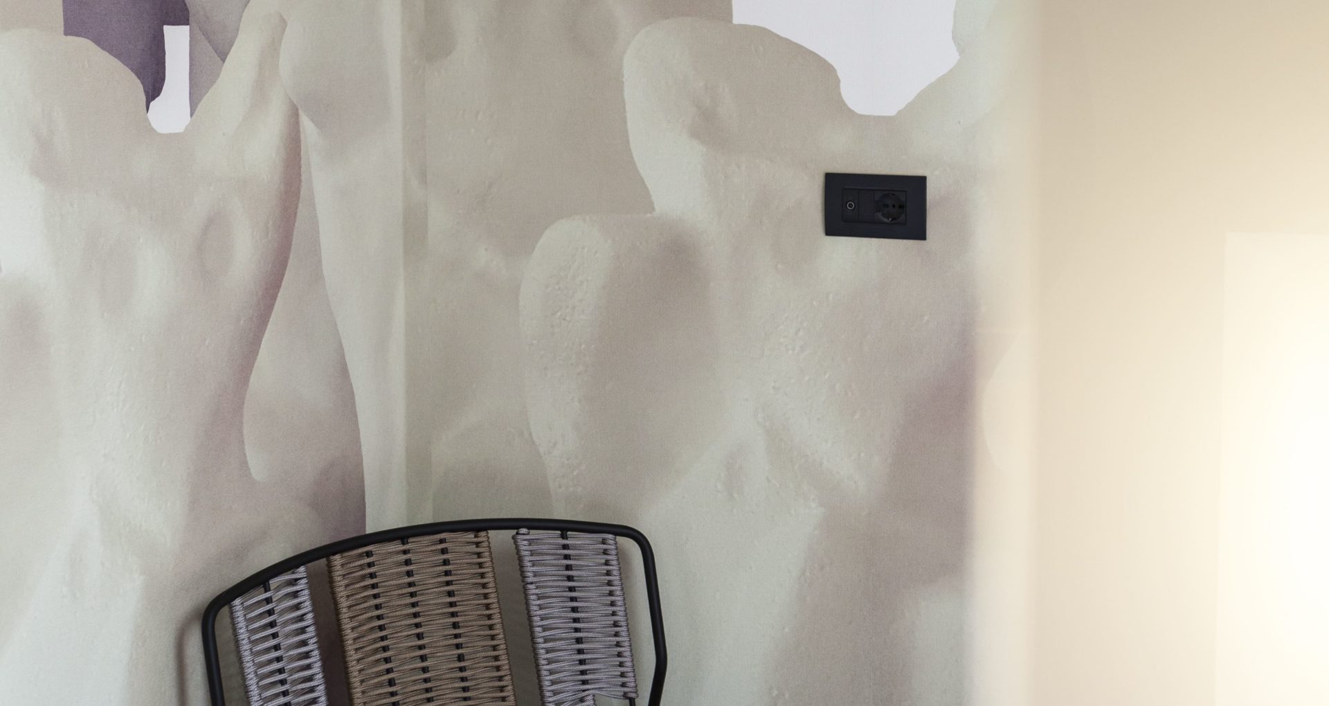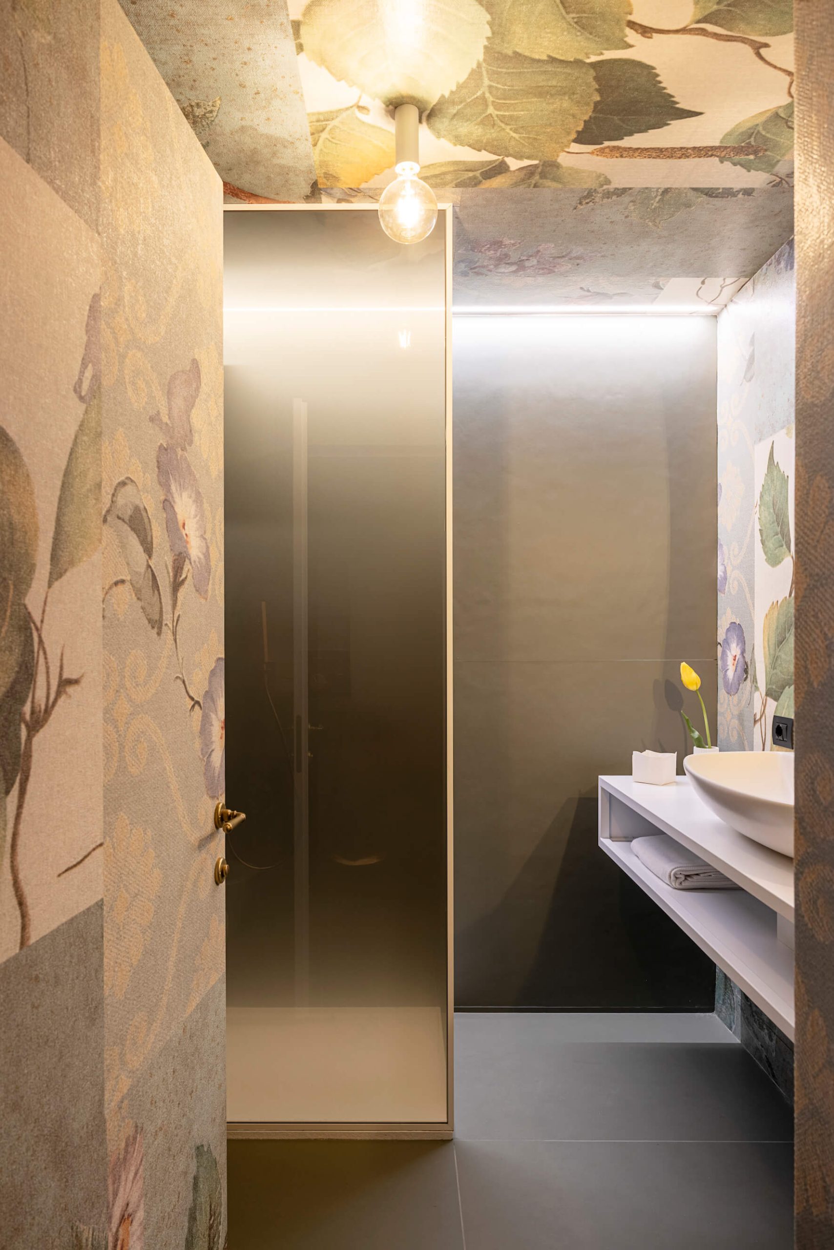 misura da maestranze locali. L’arredo neutro definisce lo spazio lasciando libere le pareti allo dispiegarsi delle wallpaper offrendo un’esperienza artistico-architettonica unica.