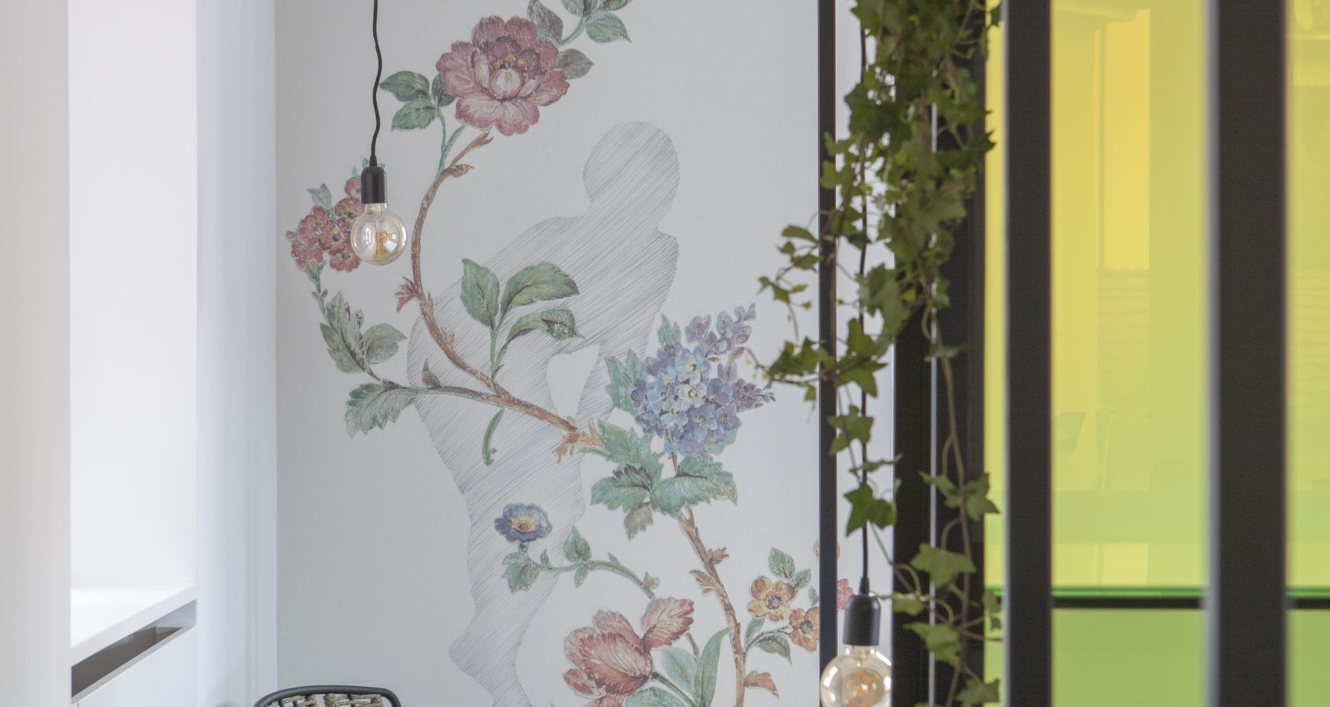 Protagoniste sono le pareti con il progetto d’arte di Donatella Spaziani realizzato su carte da parati da cui prende il titolo l’appartamento.