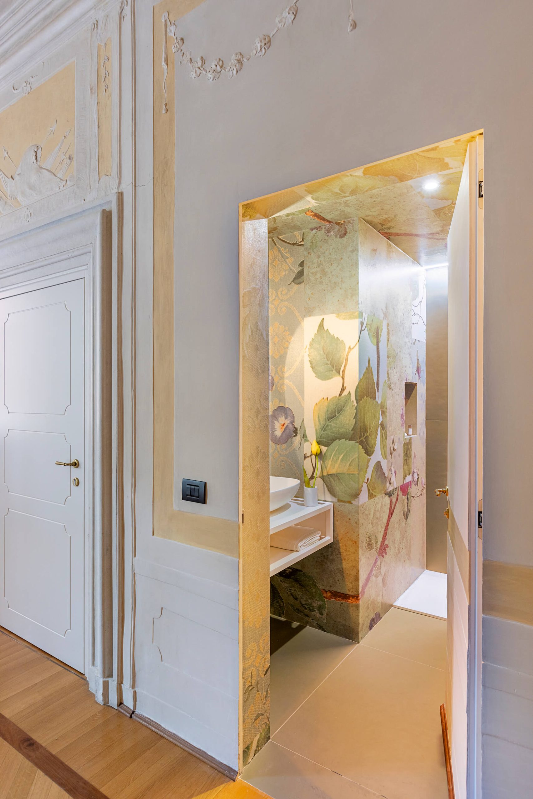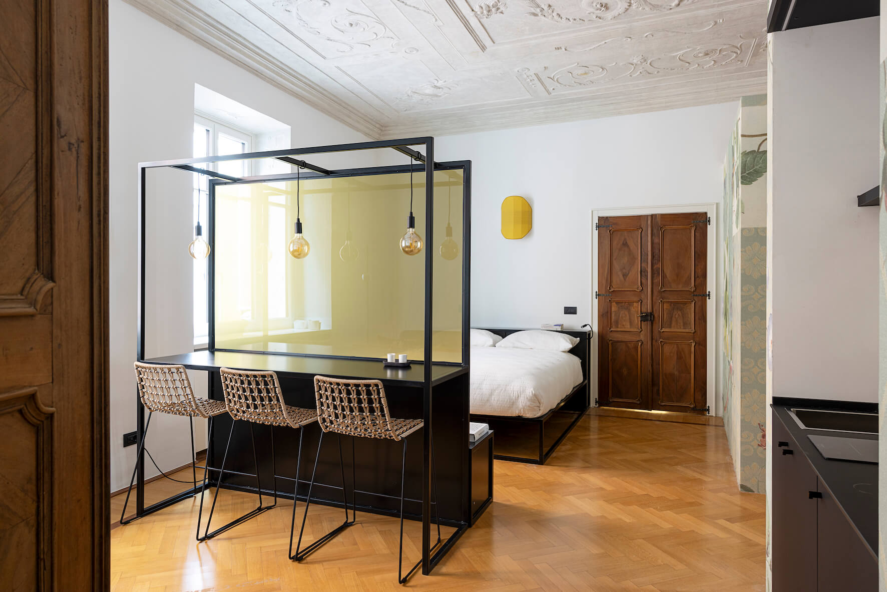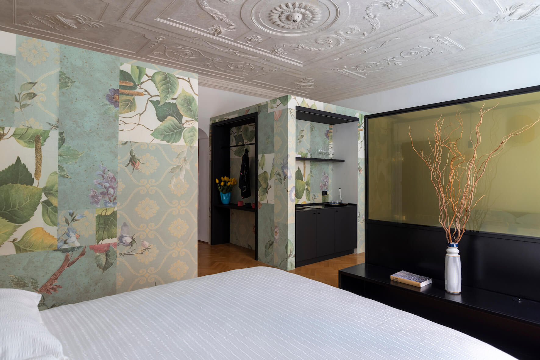 Monolocale Delux è uno studio di 50 mq completamente accessoriato. L’arte contemporanea, proposta dalla carta da parati firmata dall’artista Donatella Spaziani per CARTEdition, insieme al design e all’arredo progettato da Krej Engineering, dialogano con stucchi e decori dell’antico palazzo. Un ambiente accogliente e riservato, perfetto per due persone o per una famiglia.