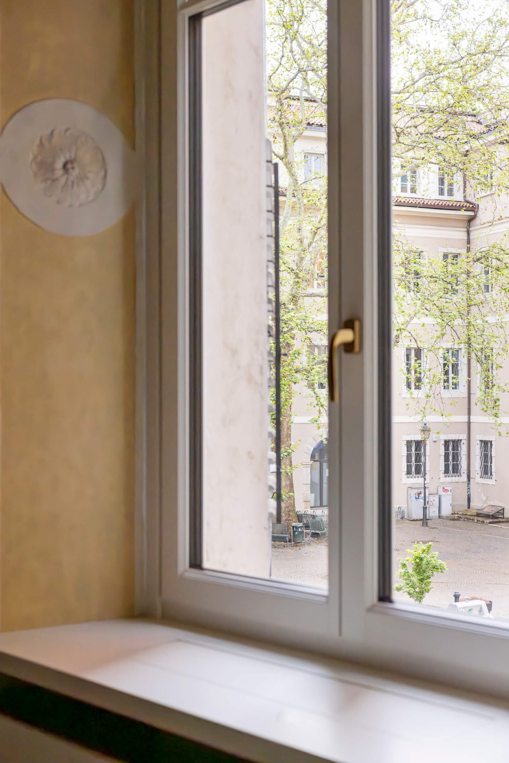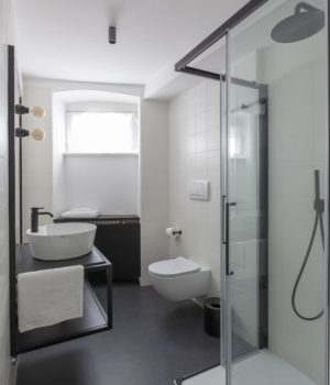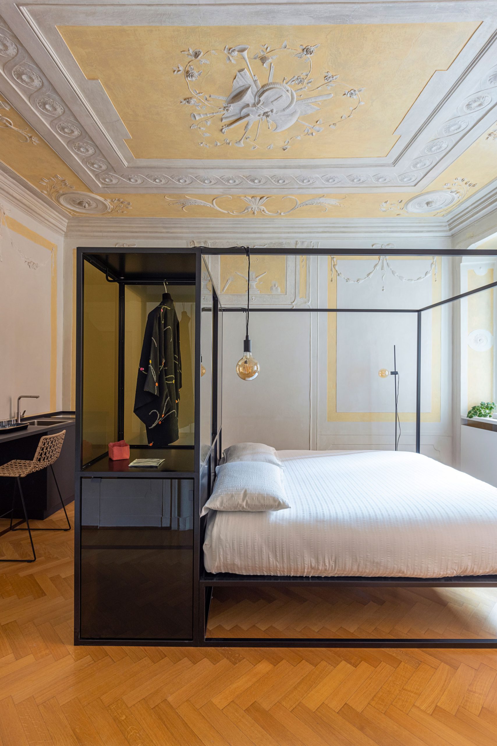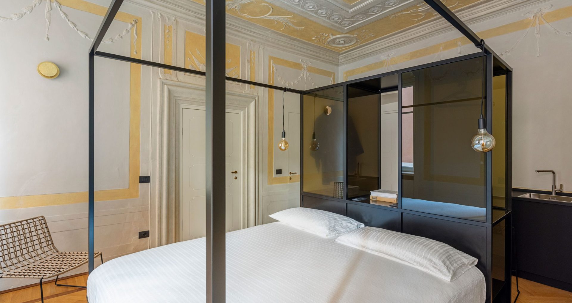 Monolocale Delux è uno studio di 50 mq completamente accessoriato. L’arte contemporanea, proposta dalla carta da parati firmata dall’artista Donatella Spaziani per CARTEdition, insieme al design e all’arredo progettato da Krej Engineering, dialogano con stucchi e decori dell’antico palazzo. Un ambiente accogliente e riservato, perfetto per due persone o per una famiglia.