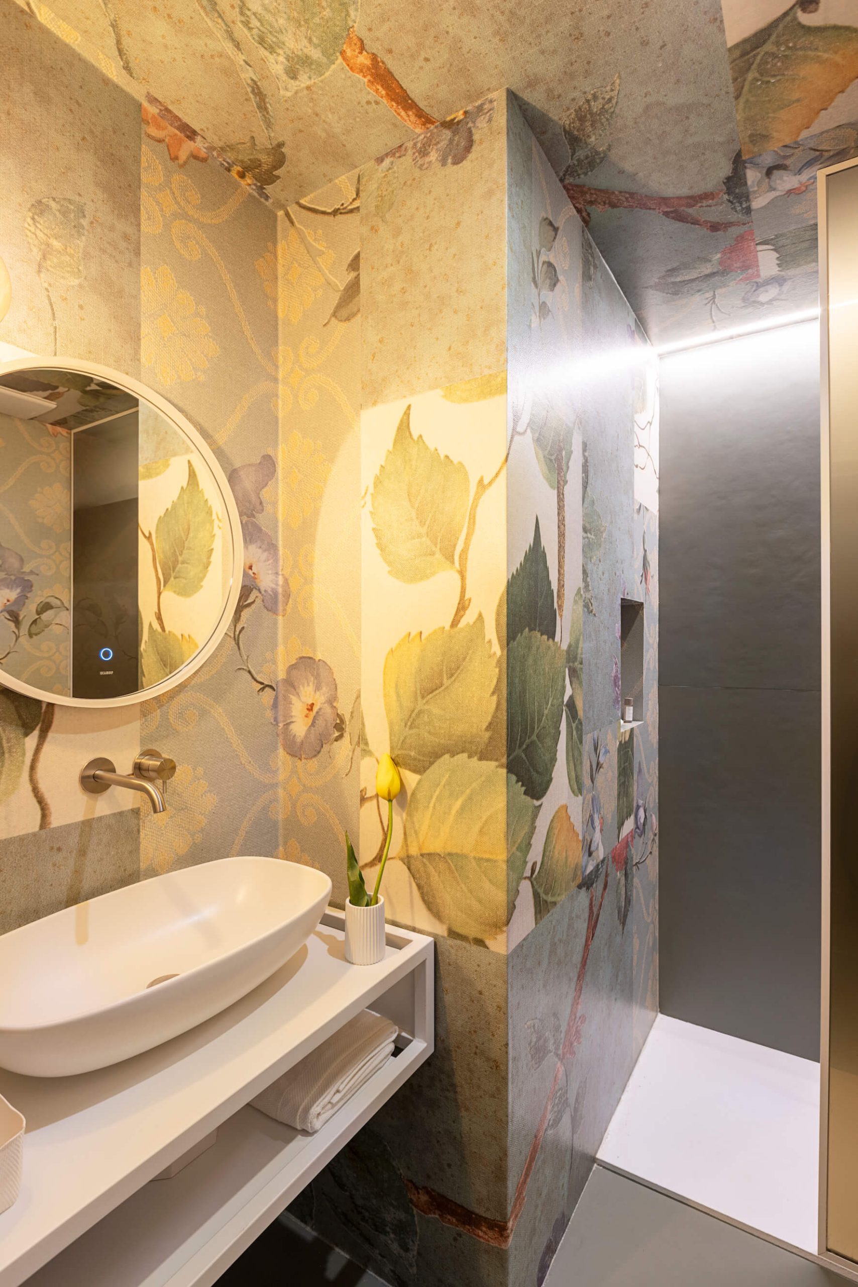 Il bagno è un’immersione nell’arte contemporanea grazie al progetto su carta da parati dell’artista Donatella Spaziani per CARTEdition.
